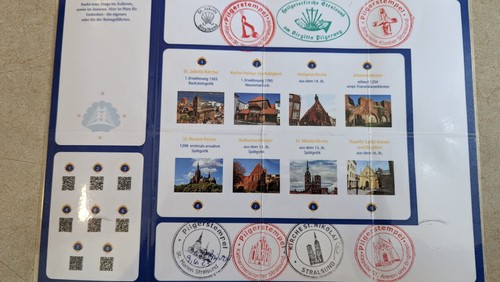 Fast überall gab es einen Stempel, in den zuvor verteilten Pilgerpass. Da wo es (noch) keine entsprechenden Stempel gab, füllte Marion die Leerstellen mit einem „Blumenstempel“ aus.
