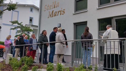 Nach langer Zeit war es nun so weit. Nach dem Sonntagsgottesdienst am 01. Juni 2025 wurde das neue Wohn- und Gästehaus in Binz von Pfarrer Bernhard Scholtz gesegnet. „Christus mansionem benedicat“ - „Christus segne dieses Haus“! Mit diesem Spruch wurde um den Schutz Jesu für die Menschen, die in dem Haus oder den Wohnungen leben, gebeten. Das Haus möge mit dem Segen Gottes erfüllt werden. Und als Fürsprecherin haben wir Maria, da das Haus den Namen „Stella Maris“ trägt. Es wurde auch um Frieden und Harmonie für die Bewohner und um gute Atmosphäre im Haus gebeten. Bei zwei Wohnungen mit Mietern und fünf Ferienwohnungen mit wechselnden Gästen ist der Segen wohl auch notwendig.
