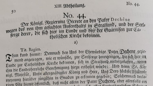 Das Jahr 1775 ist für die katholische Gemeinde „Heilige Dreifaltigkeit“ von historischer Bedeutung. Am 6.November dieses Jahres erhielt der Jesuitenpater Aegidius Dechene durch ein Dekret des schwedischen Königs Gustav dem III (König von 1771- 1792), die Erlaubnis, hier in Stralsund, das damals zu Schweden gehörte, eine katholische Missionsstation zu gründen.
