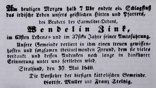 Im „Sulzbacher Kalender von 1849 steht über das Karmeliten Kloster Straubing und speziell zu Pater Wendelin Zink: „P. Wendelin Zink, der wenige Jahre nach seiner Profess auf das Gutachten seiner Ordensoberen von der Propaganda in Rom für die Mission in Stralsund bestimmt worden war,“ fand dort eine Gemeinde von beiläufig 500 Seelen in einem Kirchsprengel, der sich über Pommern und die Insel Rügen erstreckte. Auf zwanzig Stunden in der Runde waren nur zwei katholische Geistliche. In seiner Gemeinde war nun Zink nicht nur Pfarrer, sondern auch Schullehrer, und zugleich Privatlehrer. Letzteres musste er sein, um sich dadurch seinen Unterhalt zu sichern, da die arme katholische Gemeinde ihm wenig geben konnte, und der geringe Betrag, den die Propaganda für diese nordische Mission ausgeworfen hatte, nicht hinreichte, um damit standesgemäß leben und die Ausgaben für seine Kirche bestreiten zu können. Doch er überwand glücklich diese Schwierigkeiten und erwarb sich durch seine Freiheit im gesellschaftlichen Umgange die allgemeine Achtung und Liebe. So wirkte er segensreich auf seinem Posten 37 Jahre, bis er am 30.Mai 1840 vom Schlagflusse berührt verschied.