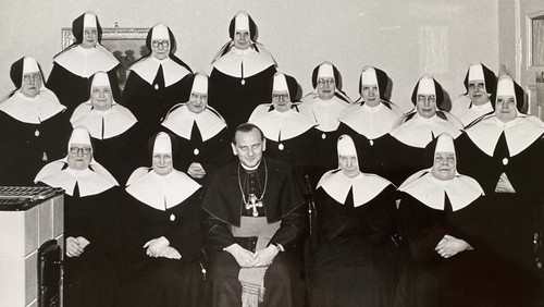 Im Jahr 1962 begingen die Borromäerinnen in Stralsund ihr 100jähriges Ortsjubiläum. Alfred Kardinal Bengsch feierte mit Priestern des Dekanates in der St. Marienkirche ein feierliches Hochamt. Im Dezember 1979 rief die Generaloberin die Stralsunder Schwestern ins Mutterhaus nach Görlitz zurück. Die meisten Borromäerinnen, die in Stralsund tätig waren, haben ihren irdischen Weg beendet. Schließen wir sie, die oft unter so unwürdigen Bedingungen und Verhältnissen in schweren Zeiten ihren aufopferungsvollen Dienst in unserer Stadt getan haben, in unser Gebet ein. Wir denken an die Schwestern Tarbula, Beningna, und Restituta, die auf unserem Friedhof ihre letzte Ruhestätte gefunden haben. Weiter denken wir an die Oberinnen Alfonsa, Petrussa, Emerika, Perpetua und Betilla. An die Schwestern Expedita, Marjella, Giselena, Firmina, Wilma und Norberta. sowie an Schwester Proba und die Küchenschwester Honesta, an die Schwestern Morina und Leona und auch die, deren Namen wir vergessen haben. Aber besonders zwei Schwester bleiben vielen in besonderer Erinnerung, Schwester Adeltrudis, die ein strenges Regiment in der Sakristei führte und Schwester Wiborada, die den Gottesdienst musikalisch umrahmte, Religionsunterricht gab, den Chor betreute und unter ihrer Leitung die Kinder und Jugendlichen manches Singspiel vor der Gemeinde aufgeführt haben.