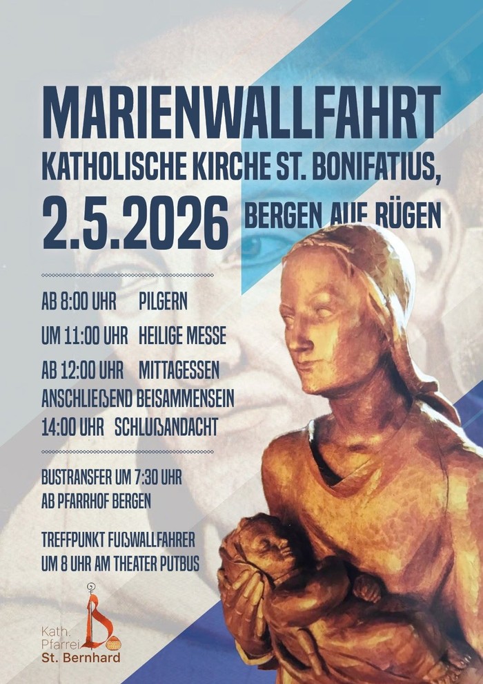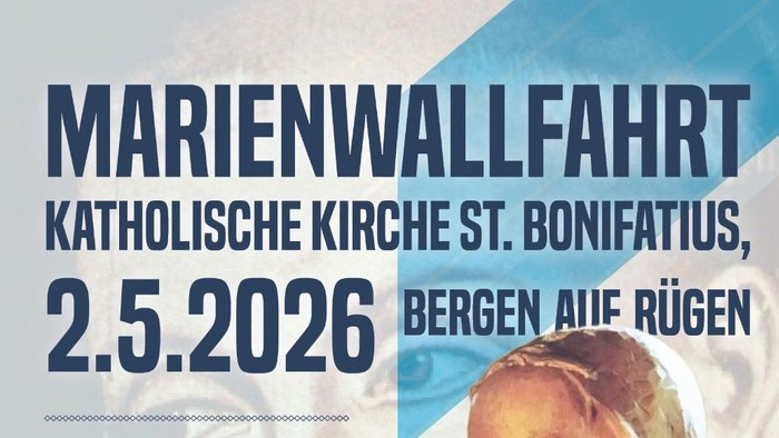 Die katholische Pfarrei St. Bernhard Stralsund-Rügen-Demmin lädt am 2. Mai 2026 zur traditionellen Bergener Marienwallfahrt ein. Gläubige aus nah und fern ehren Maria als Mutter Gottes und ihre Mutter. Höhepunkt ist die Feier der Heiligen Messe um 11:00 Uhr in der katholischen Kirche St. Bonifatius in Bergen auf Rügen.