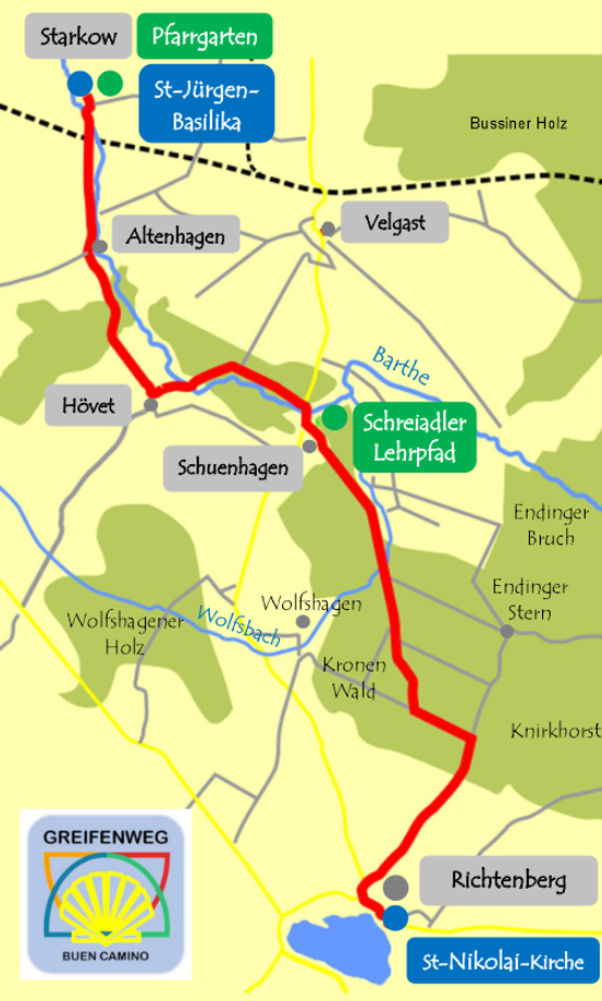 Greifen (pilgrimsleden) från Bodstedt till Richtenberg och Franzburg ansluter till ”Pilgrimsleden för den heliga Birgitta”. Fortsätter man vidare i Tribsees når man också ”Via Baltica”, en av de stora pilgrimslederna i norr.