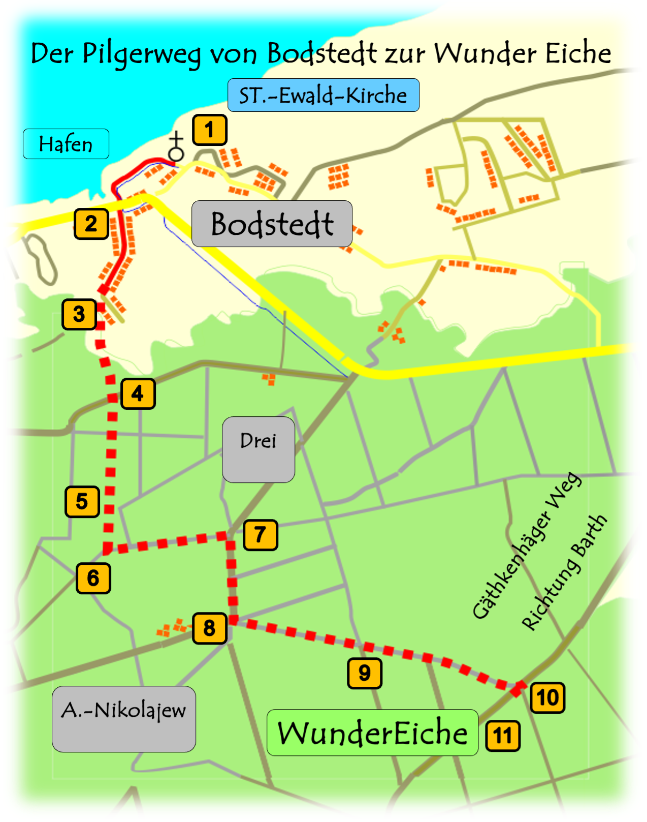 Pilgrimsfärder och vallfärder har en lång tradition i vår region. S:t Ewalds kyrka i Bodstedt, till exempel, är historiskt dokumenterad som en pilgrimsort för den ”heliga voder sunte Ewald” mellan 1474 och 1508. Kenz, med sin Mariakyrka som byggdes omkring 1398, var den mest besökta pilgrimsorten i västra Pommern på 1400-talet.