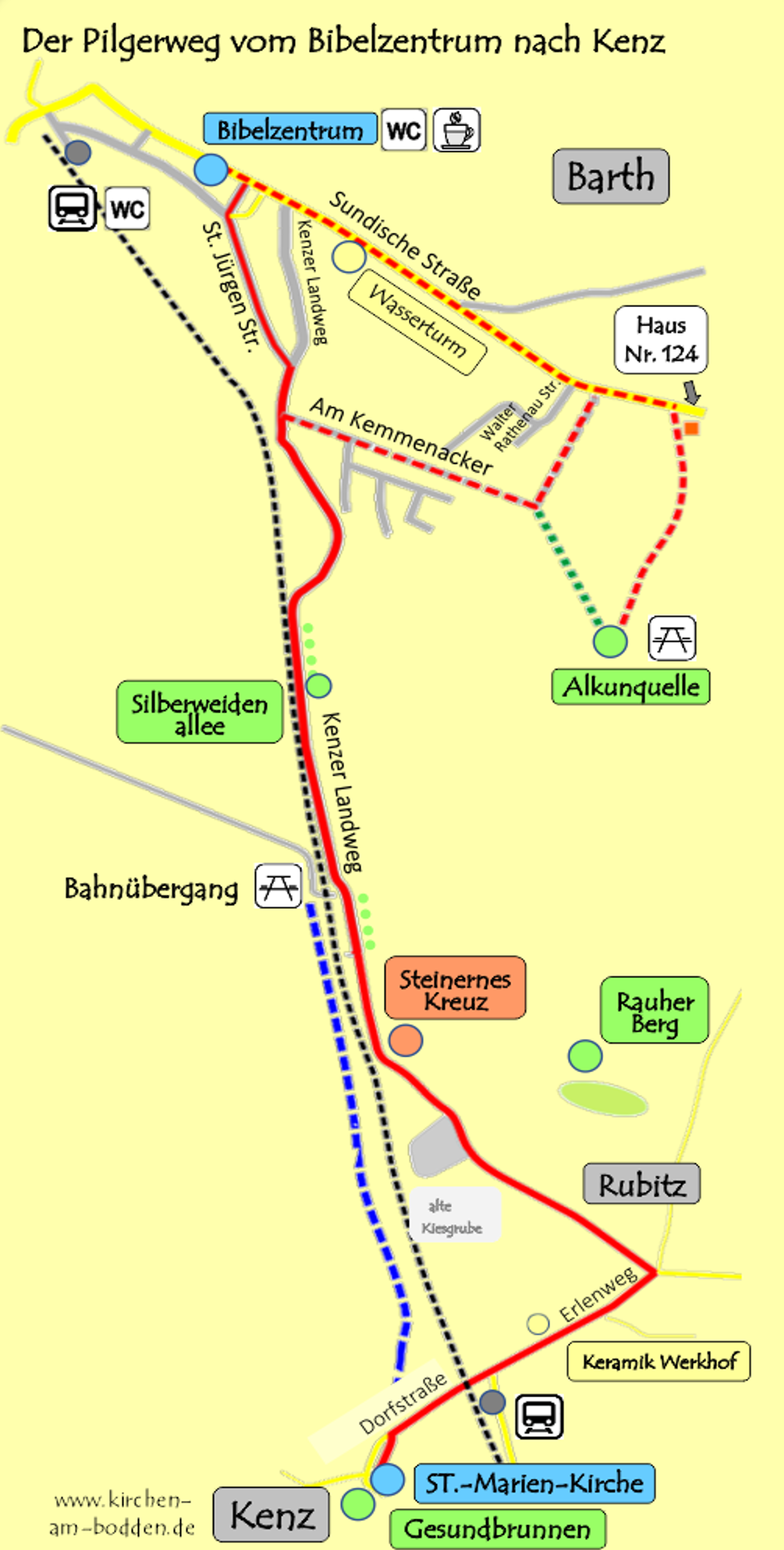 Rutten, som du kan planera individuellt, tar dig till bibelcentret på Sundische Straße 52. Följ Sundische Straße en kort bit och sväng sedan höger in på St.-Jürgen-Weg. I slutet av St.-Jürgen-Weg kommer du till Kenzer Landweg, som du följer till järnvägsövergången. Här finns en bänk (bakom järnvägsspåren) som inbjuder till en kort paus.
